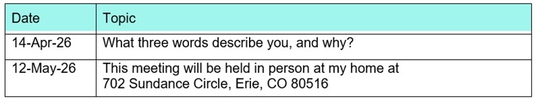 - Out to Lunch – Usually Fourth Wednesday, at noon at various local restaurants. Chairs: Jean Rohrschneider 720-542-9788; Jyotsna Raj 303-447-8831. Looking for new Chairs.