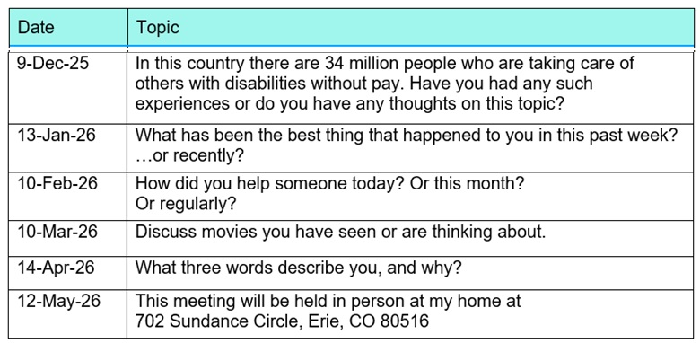 - French Conversation (Original group) – Dot Thompson 303-499-4423.