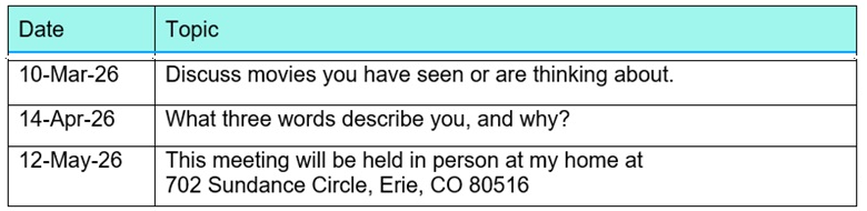 - At the March 17, 2026 Lecture Luncheon, the election of Berry Todd, President for 2026-27, Betty Johnson, Secretary-elect 2026-27, and Frieda Holley, Treasurer-elect 2026-27 will take place.