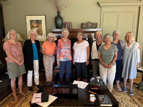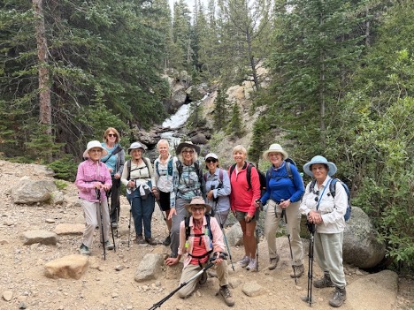 L to R in back: Frieda Holley, Susan Rapp, Kathleen Salzberg, Andrea Brose (guest of Frieda), Jean Nelson, Joanie Cardone, Linda Conlin, Carol Green, Judy Winkel, with Char Rasmussen in front. On a hike to Lost Lake August 22, 2025. Picture taken by passing hiker.